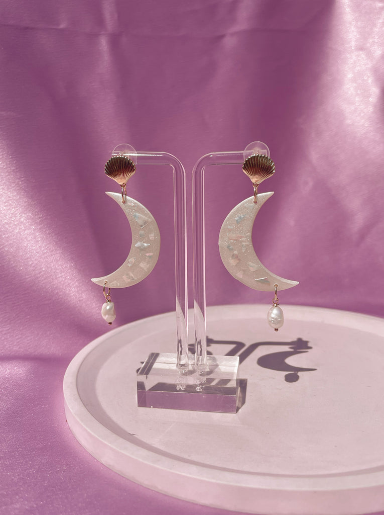 A shimmery pearlescent moon with pieces of shiny abalone shell and coated with glossy resin. A dainty freshwater pearl hangs from the bottom making these earrings so beautiful and elegant.